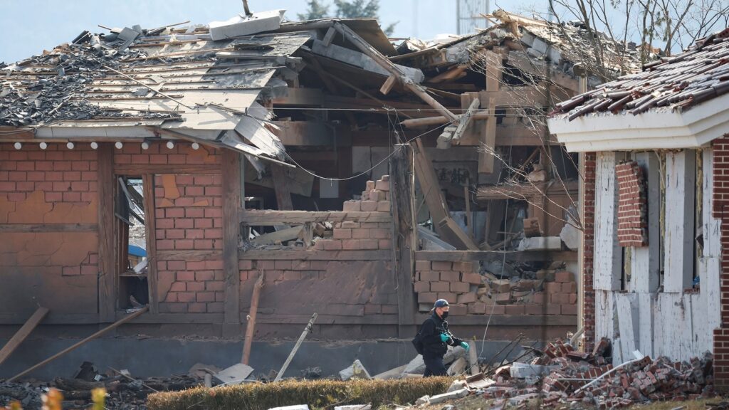 A forensic officer walks close to broken buildings after South Korea’s Air Drive mentioned that MK-82 bombs fell from a KF-16 jet exterior the capturing vary throughout joint live-fire workouts close to the demilitarized zone separating two Koreas in Pocheon, South Korea, March 6, 2025.