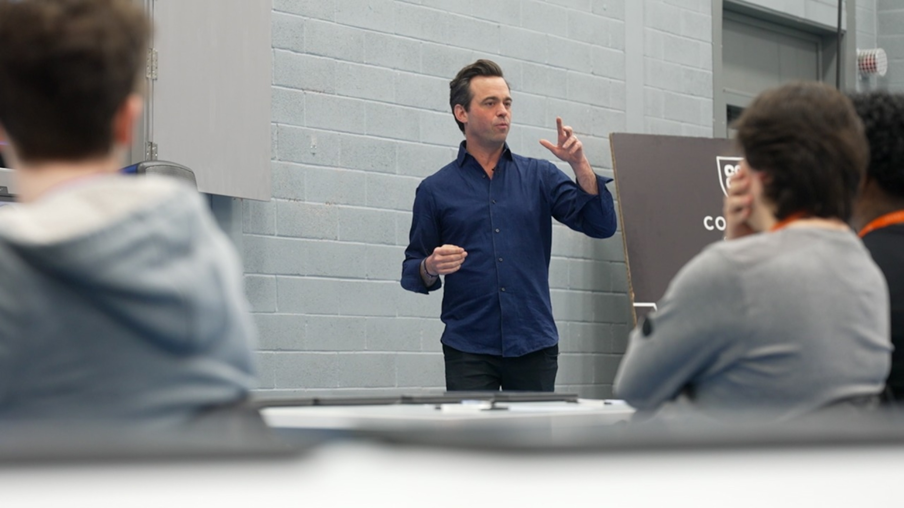Fergus Hay, the CEO of The Hacking Video games, speaks to highschool college students in Manchester, England.