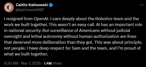 “I resigned from OpenAI. I care deeply concerning the Robotics workforce and the work we constructed collectively. This wasn’t a simple name.” She was not rejecting nationwide protection outright. She even acknowledged that “AI has an necessary position in nationwide safety.” But she warned that sure strains had been crossed. In her personal phrases, “surveillance of People with out judicial oversight and deadly autonomy with out human authorization are strains that deserved extra deliberation than they obtained.”