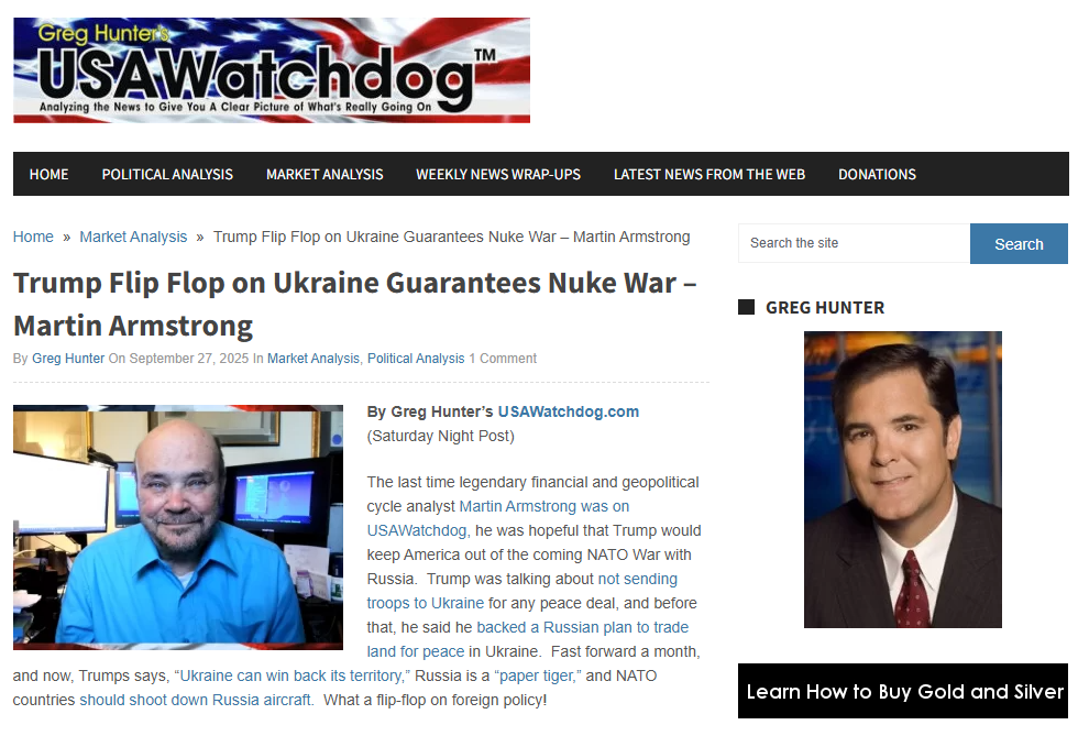 The final time legendary monetary and geopolitical cycle analyst Martin Armstrong was on USAWatchdog, he was hopeful that Trump would hold America out of the approaching NATO Warfare with Russia. Trump was speaking about not sending troops to Ukraine for any peace deal, and earlier than that, he mentioned he backed a Russian plan to trade land for peace in Ukraine. Quick ahead a month, and now, Trumps says, “Ukraine can win back its territory,” Russia is a “paper tiger,” and NATO international locations should shoot down Russia aircraft. What a flip-flop on overseas coverage!