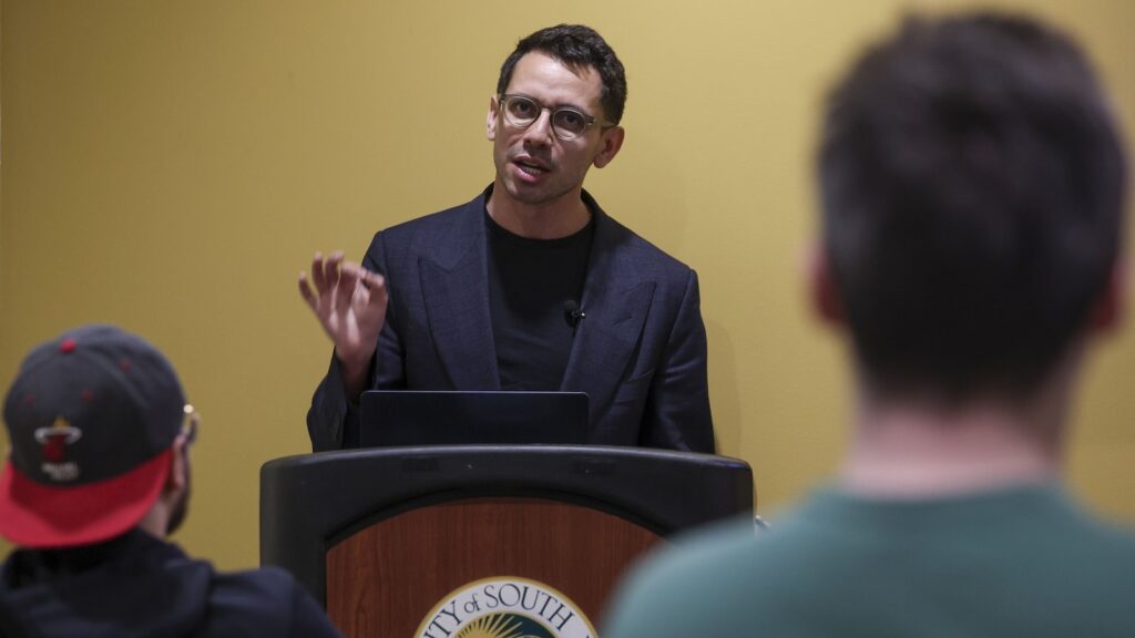 James Fishback, CEO of funding agency/asset supervisor Azoria, speaks on the Marshall Scholar Heart, Oct 6, 2025, in Tampa, Fla.