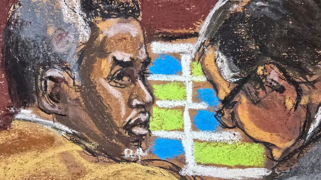 Sean “Diddy” Combs and his protection lawyer Brian Metal watch a witness being questioned throughout Combs’ intercourse trafficking trial in New York Metropolis, June 23, 2025 on this courtroom sketch.