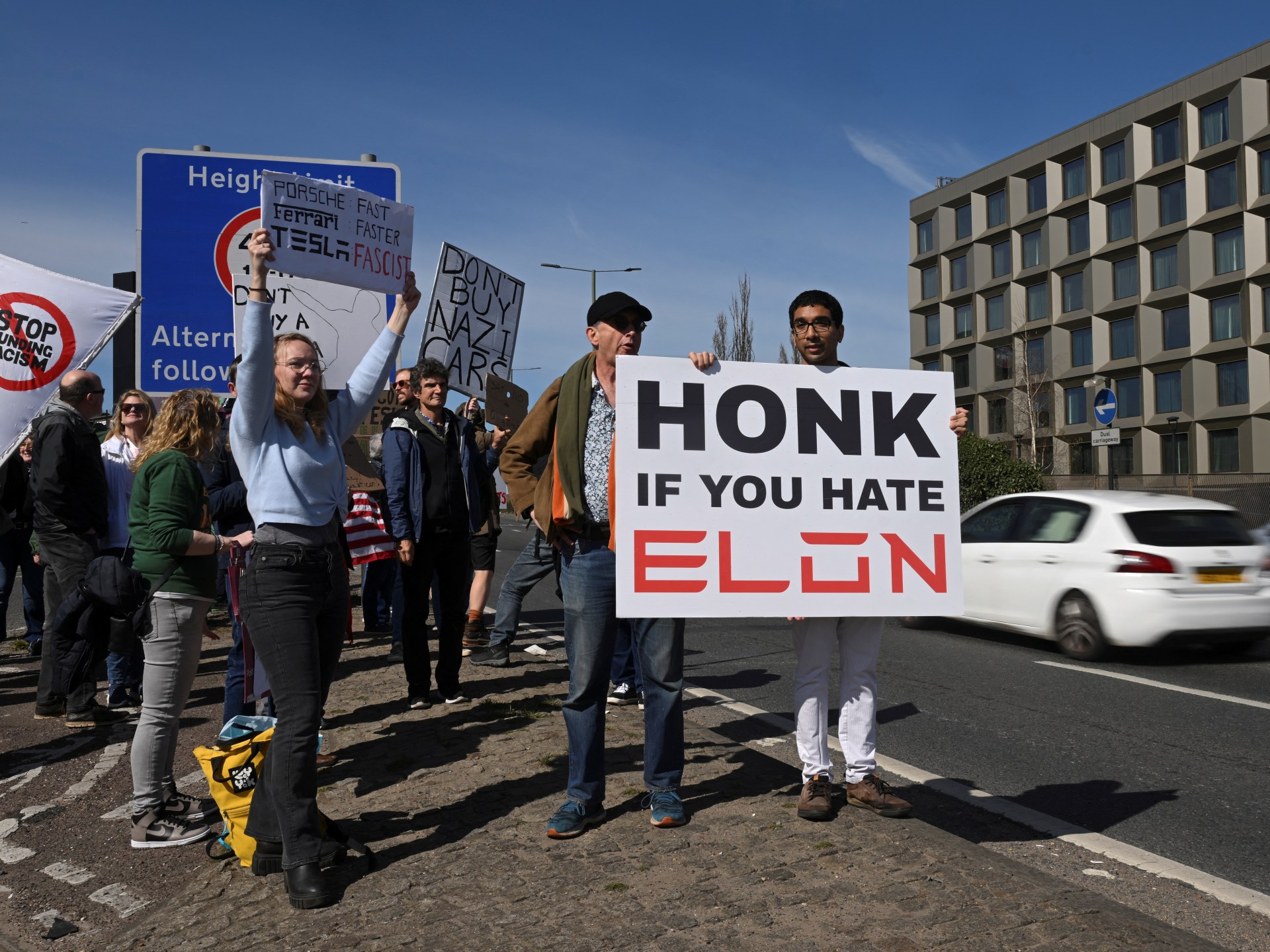 In London, about two dozen protesters held indicators lambasting Musk exterior a Tesla dealership as passing vehicles and vans tooted horns in help.