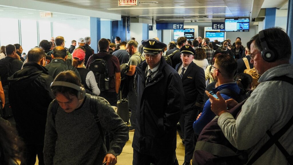 Pilots and passengers crowd a gate space as flight delays persist amid FAA measures greater than a month into the continuing U.S. authorities shutdown, at O’Hare Worldwide Airport in Chicago, Illinois, U.S., November 10, 2025.