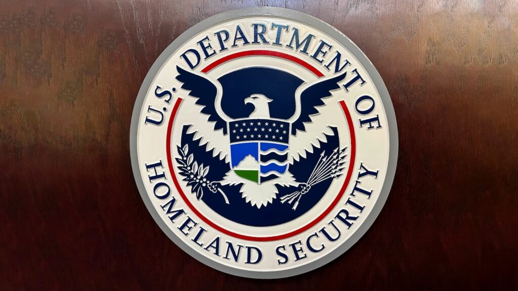 A Division of Homeland Safety seal on a podium at Immigration and Customs Enforcement (ICE) headquarters, Mar. 13, 2024.