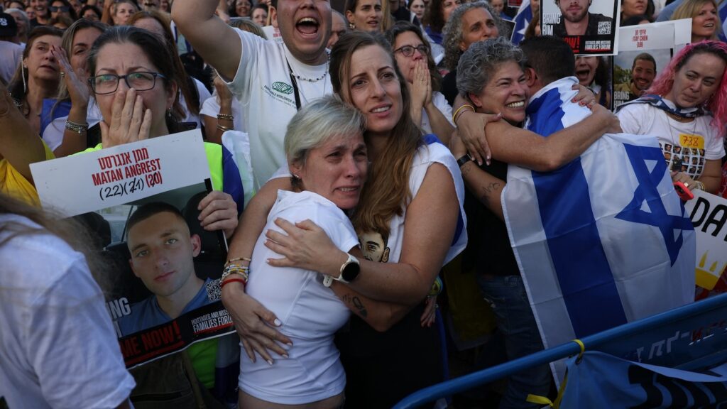 Israelis react as they await the discharge of Israelis nonetheless held in Gaza at Hostage Sq. in Tel Aviv early on Oct. 13, 2025.