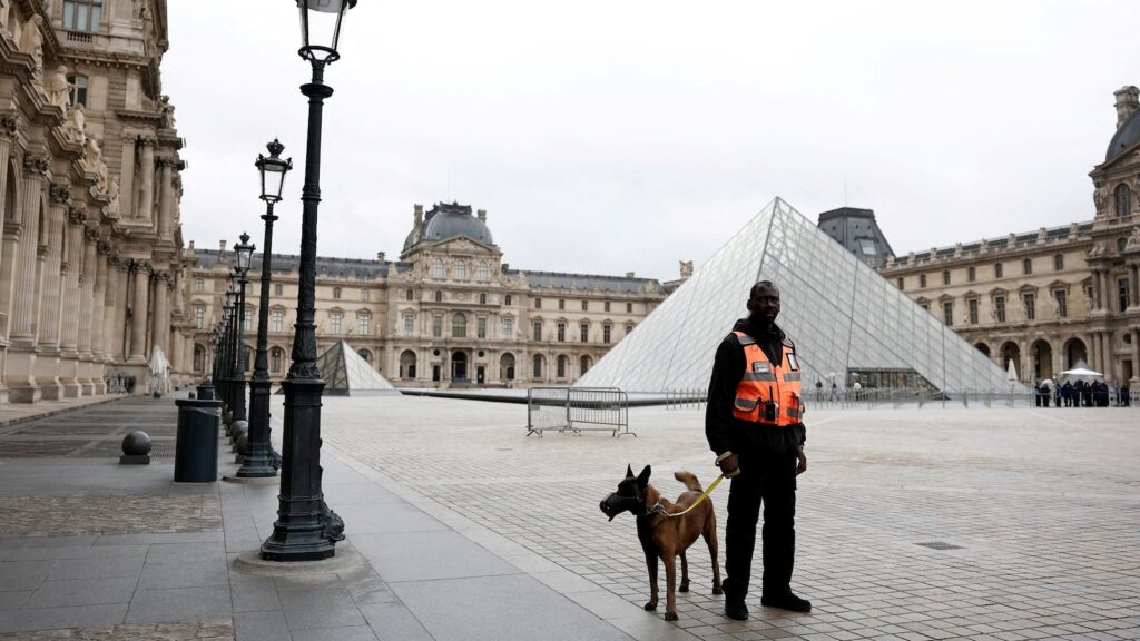 A safety worker with a canine stands close to the glass Pyramid of the Louvre Museum because the museum stays closed the day after a spectacular jewel heist by thieves who broke into the landmark by utilizing a crane and smashing an upstairs window, stealing priceless jewellery from an space that homes the French crown jewels earlier than escaping on motorbikes, in Paris, France, October 20, 2025.
