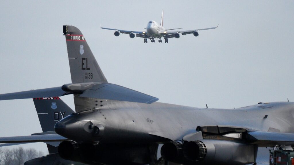 FAIRFORD, ENGLAND – MARCH 11: A cargo airplane comes into land with two US Air Power B-1 bombers within the foreground at RAF Fairford on March 11, 2026 in Fairford, England. Since UK Prime Minister Keir Starmer allowed the US to make use of British bases to launch defensive strikes in opposition to Iranian missile websites, a wide range of US navy plane together with B52 bombers, and B-1 bombers, have arrived at RAF Fairford in Gloucestershire.