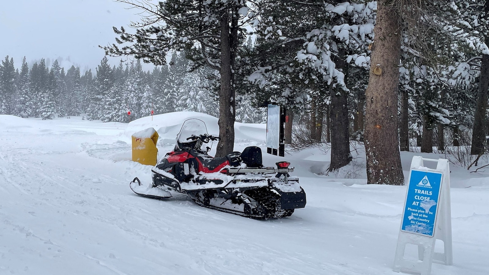A snowmobile is parked at Alder Creek Journey Heart, one among two websites the place search crews had been launched to attempt to find a gaggle of lacking skiers after an avalanche in a backcountry slope of California’s Sierra Nevada mountains, in Truckee, California, U.S. February 18, 2026.