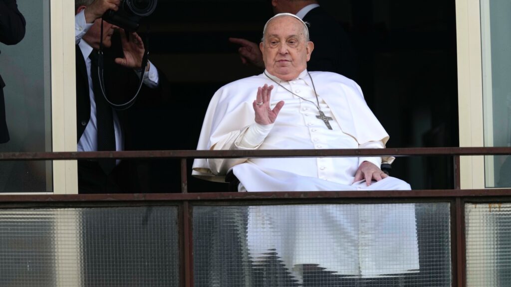 Pope Francis waving to the gang from a window of the Gemelli hospital in Rome earlier than being discharged following a 5 weeks hospitalization for pneumonia, Mar. 23, 2025.