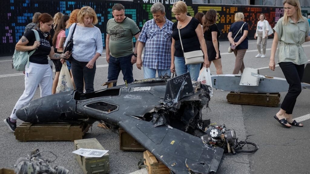 Folks have a look at a destroyed Russian fight drone at an exhibition in central Kyiv, Ukraine, on August 8, 2025.