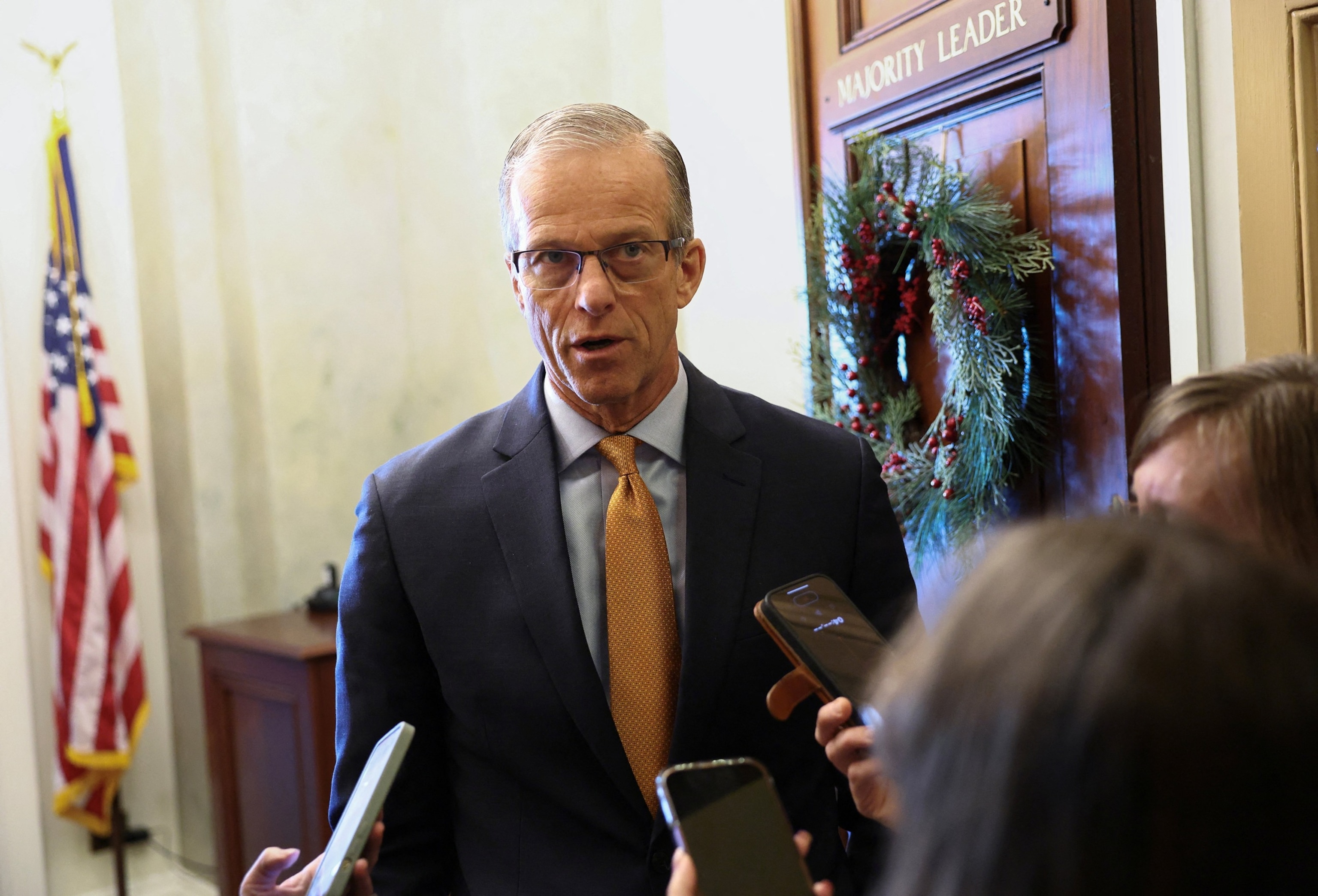 Senate Majority Chief John Thune talks to reporters following Senate votes on competing healthcare plans, on the U.S. Capitol in Washington, D.C., Dec. 11, 2025.