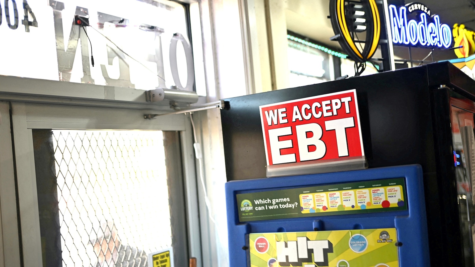 A placard inside a comfort retailer states “WE ACCEPT EBT” (Digital Profit Switch), which can be halted tomorrow, weeks into the persevering with U.S. authorities shutdown, in Thornton, Colorado, Oct. 31, 2025.