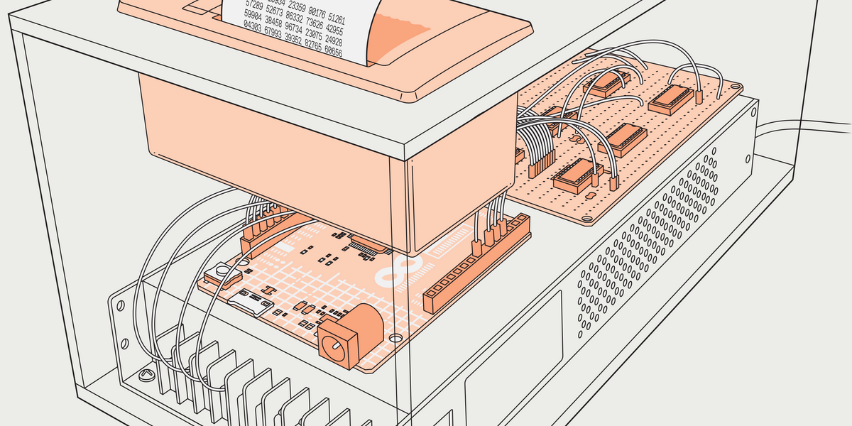 The random-number generator makes use of a group of 74HC-series logic chips [top right] to digitize electrical noise and current it as a random byte to an Arduino Uno Minima [top left]. The generator can produce roughly one byte each 200 microseconds, and the Uno converts this right into a single digit and builds up a sequence of fifty pads with 250 digits every, which it sends to the printer [bottom].James Provost