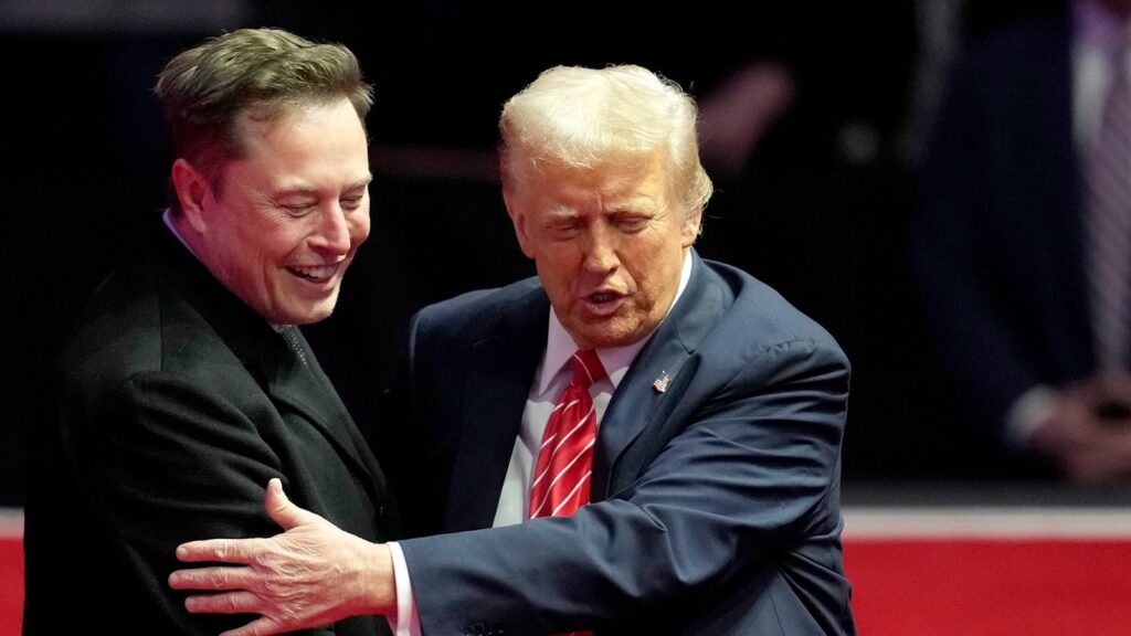 Elon Musk, left, and President-elect Donald Trump embrace as they have a look at Musk’s son X Ã A-Xii, at a rally forward of the sixtieth Presidential Inauguration, Sunday, Jan. 19, 2025, in Washington.