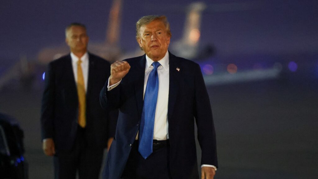 President Donald Trump gestures after returning early from the G7 Leaders’ Summit in Canada, at Joint Base Andrews, Maryland, U.S., June 17, 2025.