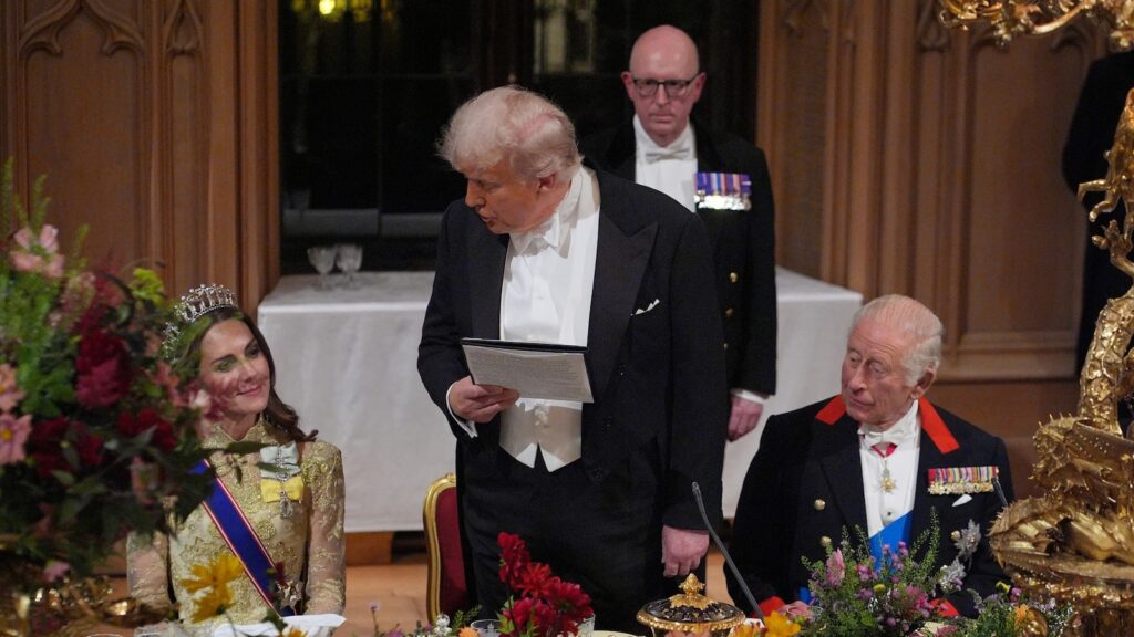 President Donald Trump and Britain’s King Charles III toast throughout an official state banquet at Windsor Fort in Windsor, Britain, September 17, 2025.