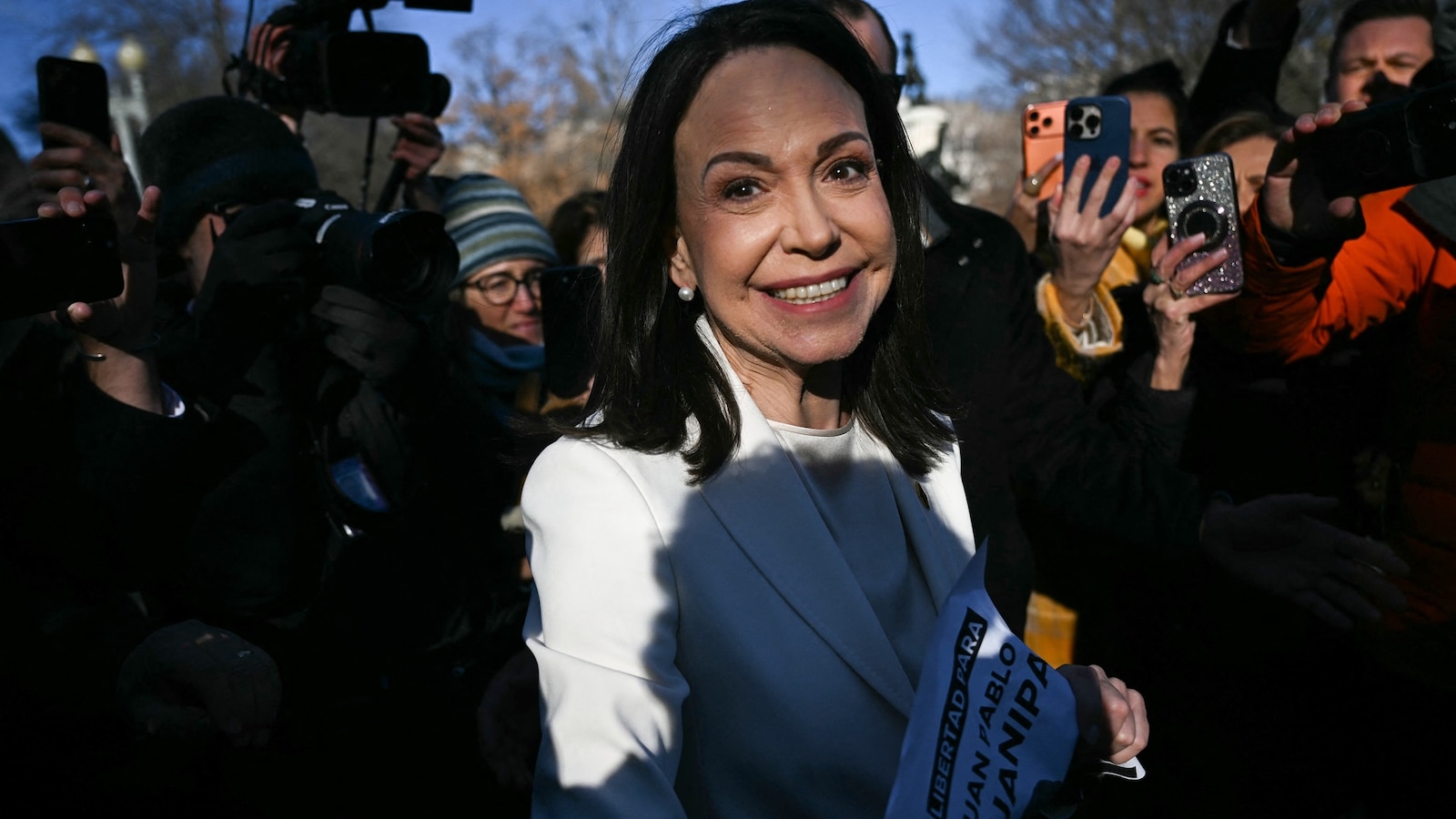 Venezuelan opposition chief Maria Corina Machado greets supporters on Pennsylvania Avenue close to the White Home after assembly with President Donald Trump, Jan. 15, 2026, in Washington.
