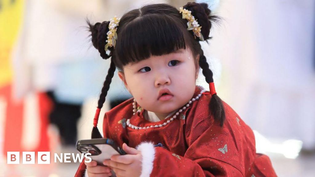 Getty Images This photo taken on 19 November 2023 shows a child wearing a red Chinese traditional dress, known as Hanfu, looking at a smartphone during a Hanfu parade in Shenyang in China's northeastern Liaoning province. Getty Photographs