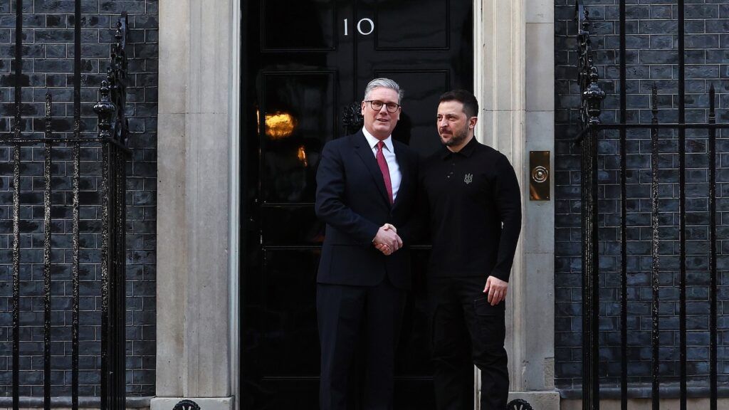 Britain’s Prime Minister, Sir Keir Starmer welcomes Ukrainian President, Volodymyr Zelensky to 10 Downing Road on March 1, 2025, in London.